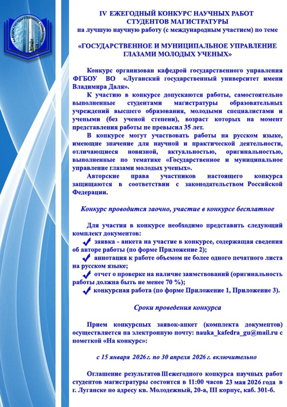 Кафедра государственного управления ФГБОУ ВО «Луганский государственный университет имени Владимира Даля» проводит 11 февраля 2026 года научно-практическую конференцию (с международным участием) ко Дню российской науки «Наука в интересах государственного и муниципального управления», в работе которой планируется участие ученых ведущих научно-исследовательских и образовательных учреждений, представителей исполнительных, судебных, правоохранительных и иных государственных органов и органов местного самоуправления.
