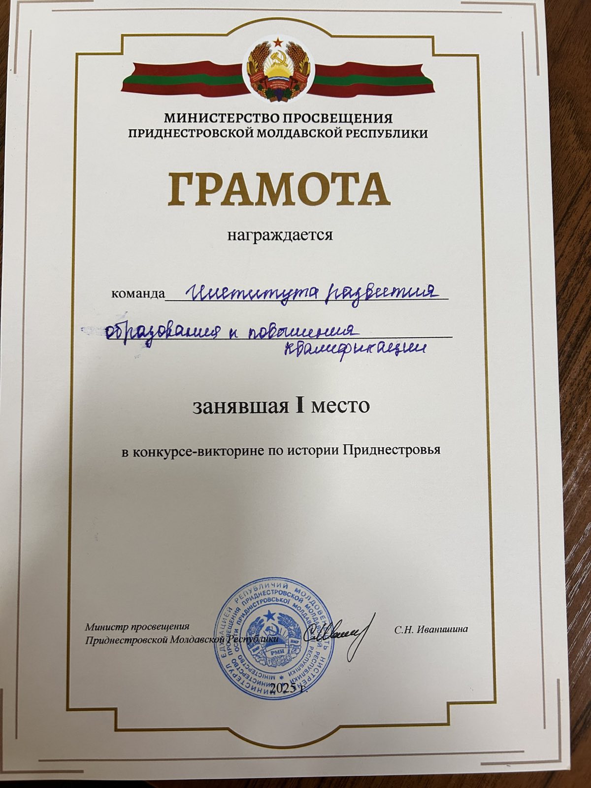 Сегодня, 14 октября 2025 года команда ГОУ ДПО «Институт развития образования и повышения квалификации» одержала убедительную победу, заняв первое место в конкурсе-викторине по истории Приднестровья. Мероприятие было организовано Министерством просвещения Приднестровской Молдавской Республики.