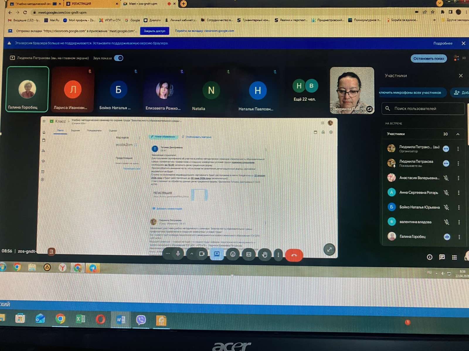 22.04.2026 г. на базе ГОУ ДПО «Институт развития образования и повышения квалификации» кафедрой педагогического менеджмента и профессионального образования был проведён учебно-методический семинар «Безопасность образовательной среды: профилактика травматизма и создание комфортных условий труда» для руководителей, ответственных по охране труда, педагогических работников и специалистов организаций общего и профессионального образования.