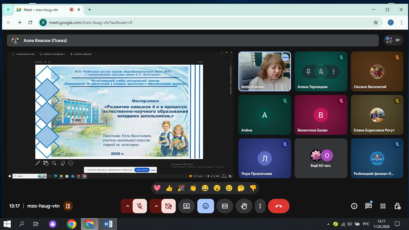 11 марта 2026 года на базе Рыбницкого филиала ГОУ ДПО «Институт развития образования и повышения квалификации» совместно с МОУ «Рыбницкая русская средняя общеобразовательная школа № 10 с гимназическими классами имени А.К. Белитченко» состоялся учебно-методический семинар «Формирование 4К компетенций у младших школьников в образовательном процессе».